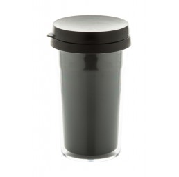 Cană din plastic, cu perete dublu şi cu capac. Între pereţi se poate introduce o grafică personalizată. Ambalată in cutie albă de carton. 250 ml. -