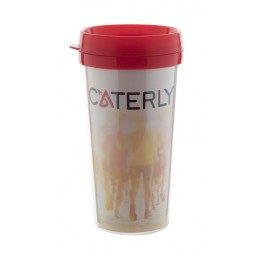 Cană termoizolantă cu perete dublu, din plastic, orificiu pe capac.Între pereţi se poate introduce o grafică personalizată.Ambalată in cutie albă de carton.450ml.
