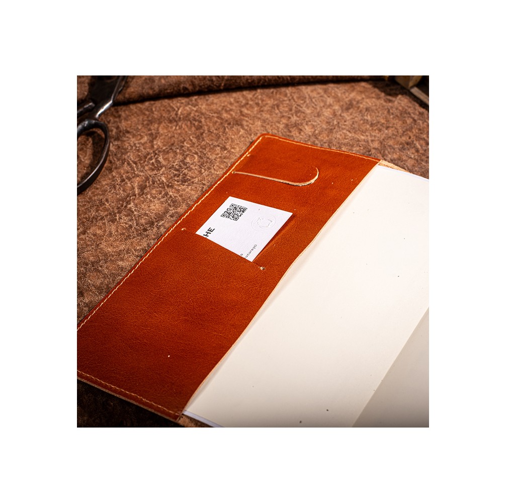 Copertă buretată din piele naturală texturată, închisă cu clapă din piele, suport pentru pix.